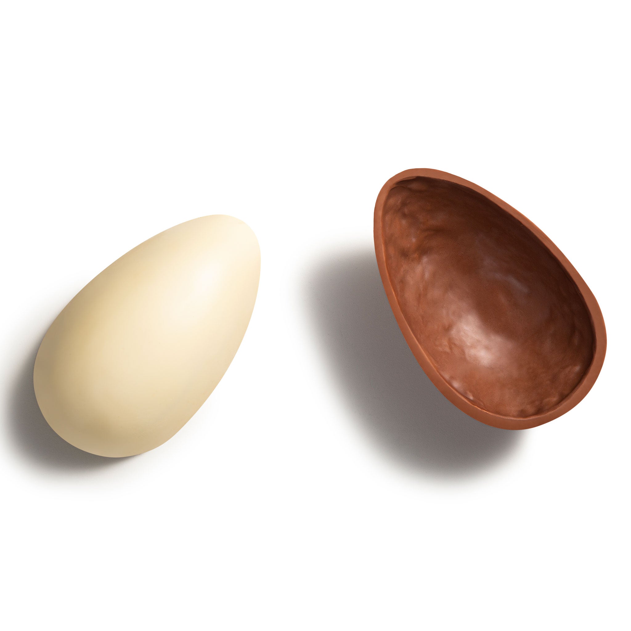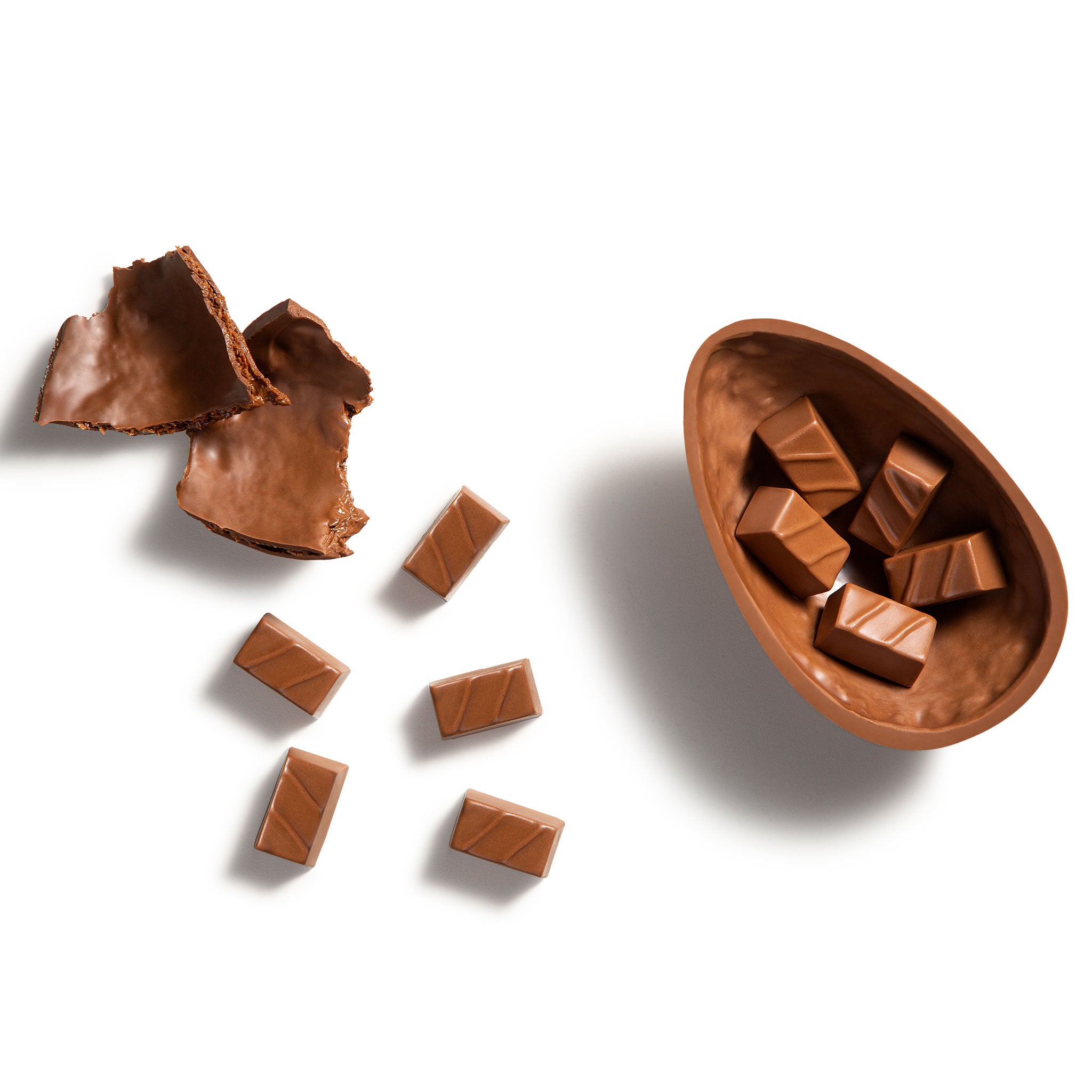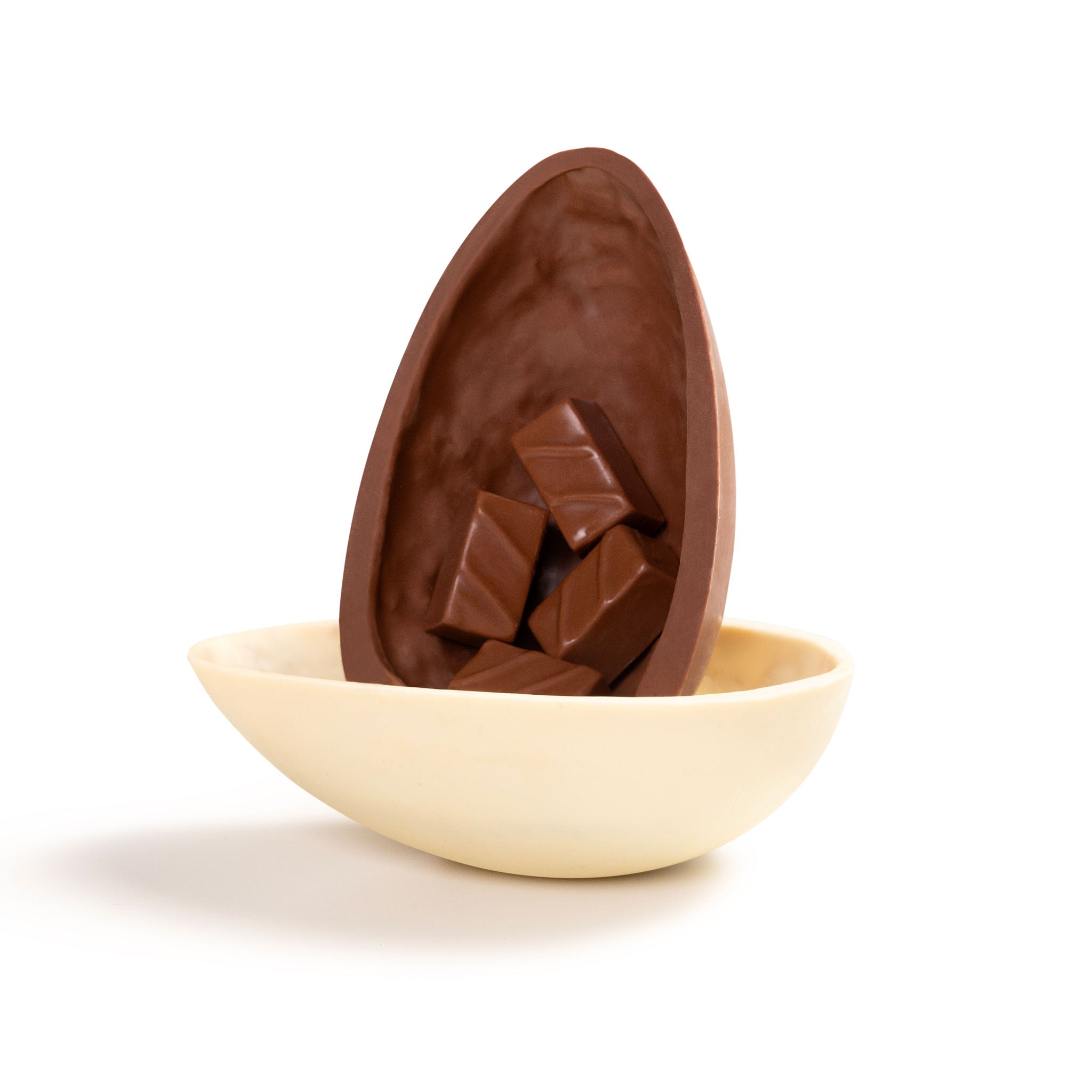 Milk and white chocolate Easter egg with caramelized French biscuit and milk chocolate bonbons with caramelized French biscuit.